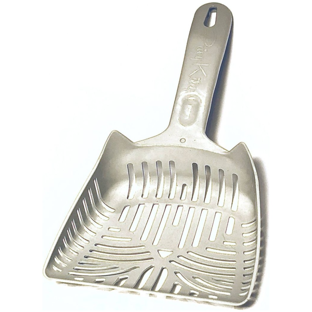 Privy Kitty Rake is especially designed for raking inside of the Privy Kitty Exterior Mounting Litter Station and it fits perfectly with the inner box radius in each corner. It is designed to have the appearance of a cats face and nose, with cute Kitty ears.